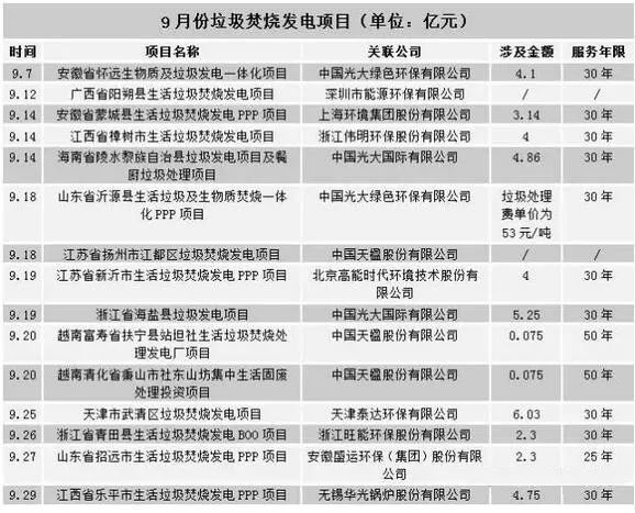 ??據(jù)不完全數(shù)據(jù)顯示,2017年9月共公開(kāi)了15個(gè)垃圾焚燒發(fā)電項(xiàng)目,涉及金額超40億。中國(guó)光大綠色環(huán)保有限公司公開(kāi)的3個(gè)新項(xiàng)目,總投資逾9億元,浙江省海鹽縣的垃圾發(fā)電項(xiàng)目單筆價(jià)值也在5億左右,江西樂(lè)平市垃圾焚燒項(xiàng)目也預(yù)計(jì)投資約4.7億元。